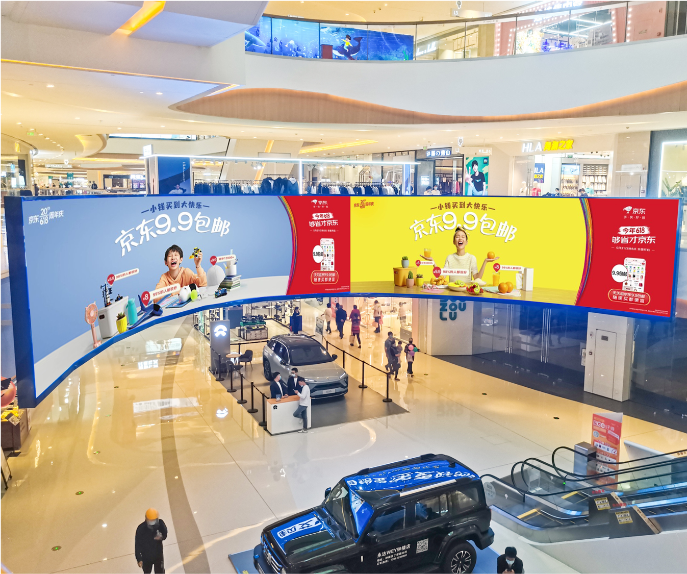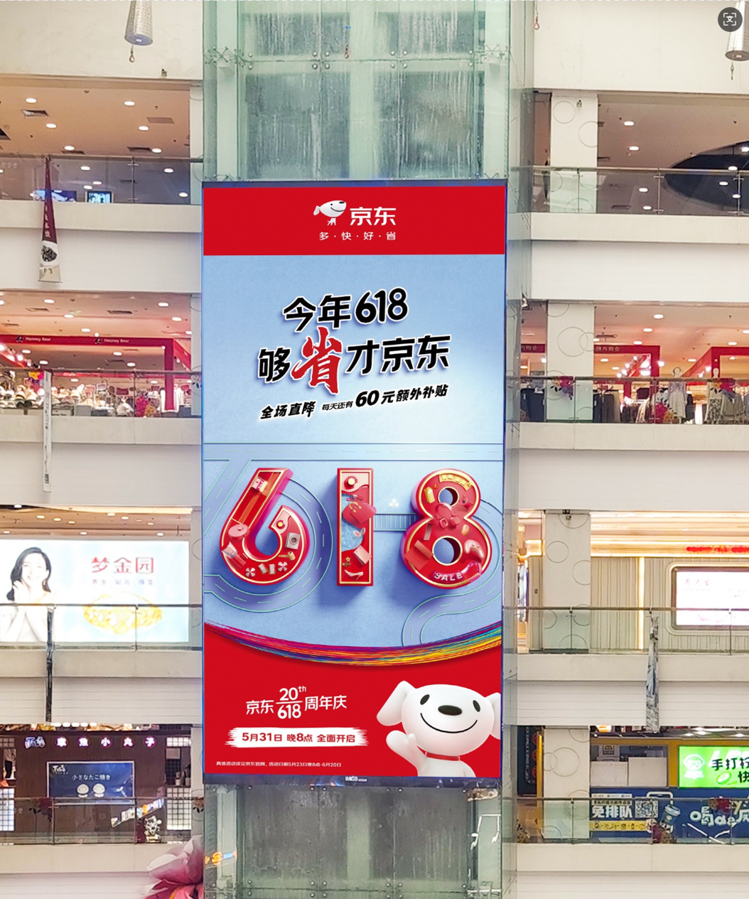1. 在嘈杂的线下环境中建立一个稳定、可重复识别的视觉阵地,不断巩固京东作为可靠、可信赖的购物平台的心智定位,包框信息提供恒定的转化入口。